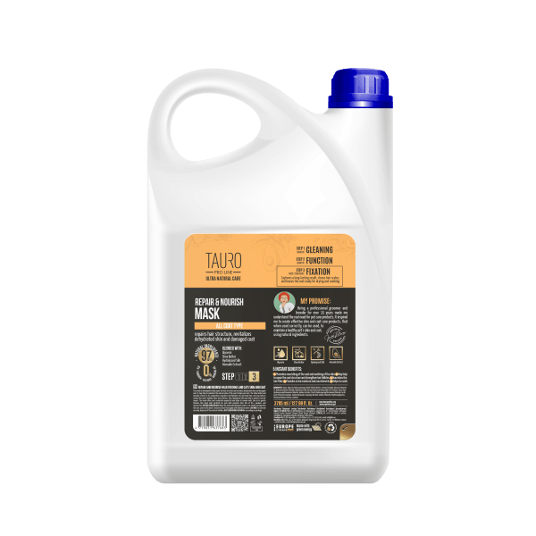 Tauro Pro Line ULTRA NATURAL CARE Repair & Nourish mask was created by professionals. The product is designed to strengthen hair, deeply moisturize the skin and coat, and give it shine. Due to the unique composition of active substances, the hair structure is moisturized and restored, becomes softer, the hair becomes easy to manage, smooth and easy to comb. The glycerin contained in the product acts as a natural moisturizer: it deeply saturates the skin and hair with moisture, can improve hair elasticity, and reduce hair loss. The shea butter and avocado extract contained in the mask nourishes and moisturizes dry, weak hair, and can help restore the coat's healthy shine and softness. Hydrolyzed silk helps protect the hair from UV rays. The mask with moisturizing and restorative properties is perfect for removing tangles. Thanks to its gentle formula, the mask is perfect for pets with sensitive skin: the product is made without SLS, parabens, mineral oils and silicones.